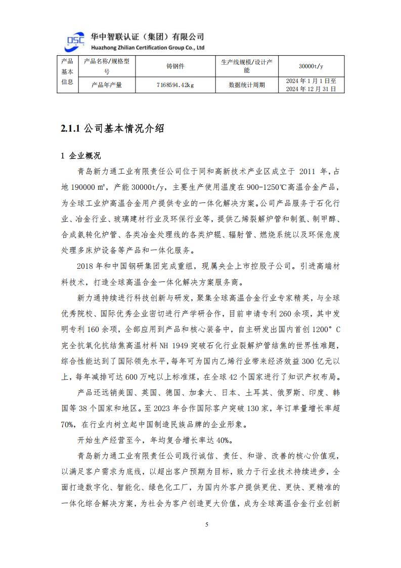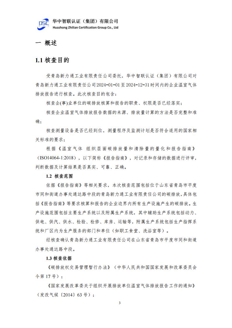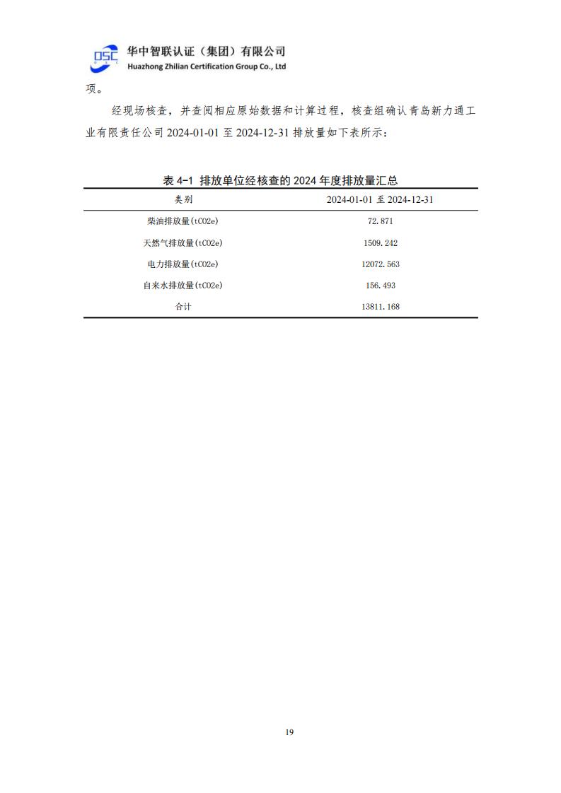 受青岛新力通工业有限责任公司委托,华中智联认证(集团)有限公司对青岛新力通工业有限责任公司2024-01-01至2024-12-31时间内的企业温室气体排放报告进行核查。